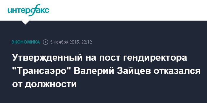Москва. 5 ноября. INTERFAX.RU - Валерий Зайцев, которого совет директоров "Трансаэро" 23 октября утвердил на должность гендиректора компании, написал заявление о сложении с себя полномочий, сообщил "Интерфаксу" источник в компании.