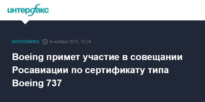 Москва. 6 ноября. INTERFAX.RU – Представители компании Boeing примут участие в совещании Росавиации по вопросу отзыва сертификата типа всех модификаций Boeing 737, которое пройдет в пятницу.