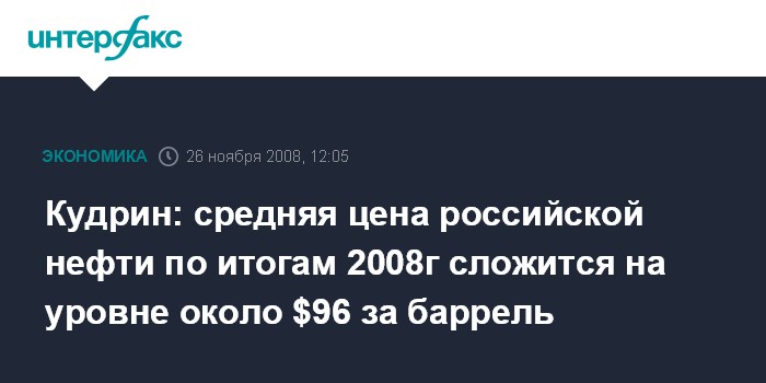 Москва. 26 ноября. INTERFAX.RU - Средняя цена российской нефти по итогам 2008 года сложится на уровне около $96 за баррель, сообщил вице-премьер, министр финансов РФ Алексей Кудрин, выступая в Совете Федерации в среду.