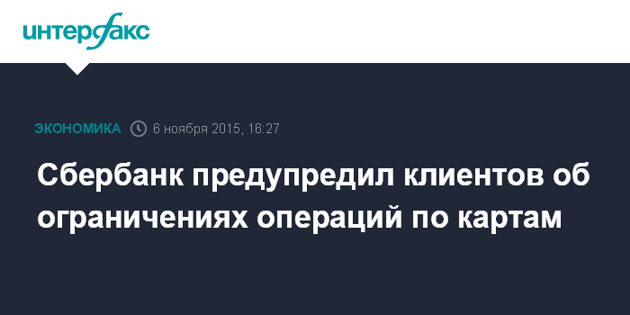 Москва. 6 ноября. INTERFAX.RU – В данный момент клиенты Сбербанка могут столкнуться в ограничении обслуживания своих банковских карт, сообщили "Интерфаксу" в колл-центре кредитной организации.