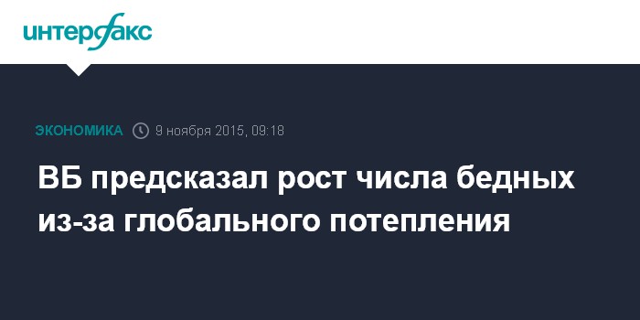 Москва. 9 ноября. INTERFAX.RU - Количество бедных в мире к 2030 году может вырасти на 100 млн человек, если не будут предприняты достаточные меры для предотвращения глобального потепления, сообщается в докладе Всемирного банка.