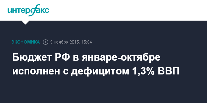 Москва. 9 ноября. INTERFAX.RU – Дефицит федерального бюджета РФ в январе-октябре 2015 года составил 768,4 млрд рублей, или 1,3% ВВП, сообщила журналистам первый замминистра финансов Татьяна Нестеренко. Объем ВВП за десять месяцев составил 59,734 трлн рублей.