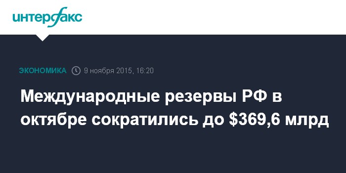 Москва. 9 ноября. INTERFAX.RU – Объем международных резервов РФ в октябре 2015 года уменьшился на $1,627 млрд, или на 0,4%, до $369,640 млрд с $371,267 млрд, следует из информации на сайте ЦБ РФ.