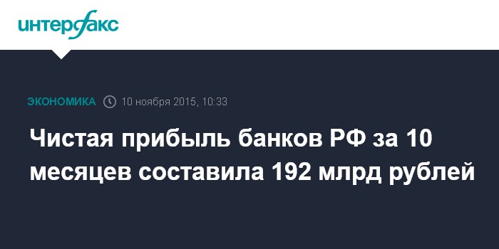 Москва. 10 ноября. INTERFAX.RU – Российские банки за 10 месяцев 2015 года получили чистую прибыль в размере 192 млрд рублей, сообщил первый зампред ЦБ РФ Алексей Симановский на встрече руководства Банка России с банкирами во вторник.