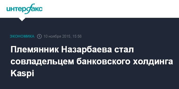 Москва. 10 ноября. INTERFAX.RU – Племянник президента Казахстана Кайрат Сатыбалдыулы стал владельцем миноритарного пакета акций банковского холдинга Kaspi, созданного на базе казахстанского Kaspi Bank, входящего в топ-10 крупнейших банков республики.