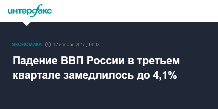 Москва. 12 ноября. INTERFAX.RU – ВВП России в третьем квартале 2015 года снизился по сравнению с аналогичным периодом прошлого года на 4,1%. Такую первую оценку распространил в четверг Росстат.