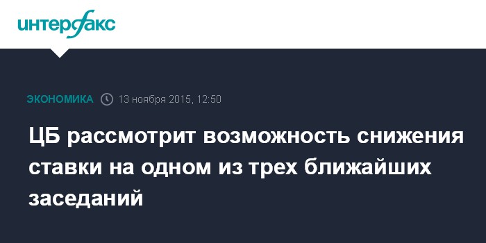 Москва. 13 ноября. INTERFAX.RU – Банк России рассмотрит возможность снижения ставки на одном из трех ближайших заседаний, заявила глава ЦБ РФ Эльвира Набиуллина.