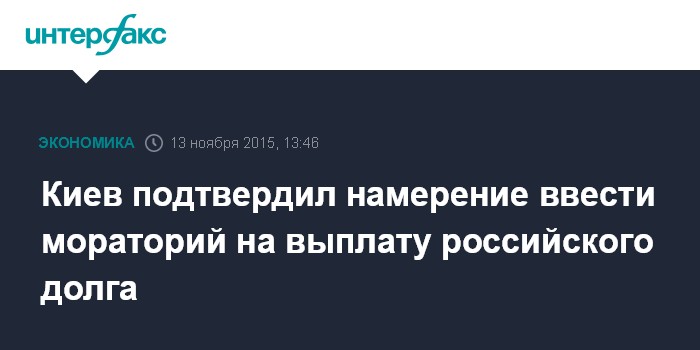Москва. 13 ноября. INTERFAX.RU – Правительство Украины введет мораторий на выплату долга по "российским" еврооблигациям на $3 млрд, если Москва не согласится с предложенными условиями реструктуризации, заявил премьер-министр Украины Арсений Яценюк.