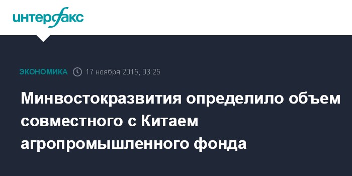 Москва. 17 ноября. INTERFAX.RU - Объем средств создаваемого Российско-Китайского фонда агропромышленного развития на начальном этапе составит $3 млрд, сообщила пресс-служба Минвостокразвития РФ по итогам переговоров министра РФ по развитию Дальнего Востока Александра Галушки и заместителя руководителя Государственного комитета КНР по развитию и реформе Цзичже Нина.
