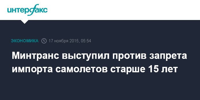 Москва. 17 ноября. INTERFAX.RU - Министерство транспорта РФ выступило против запрета ввозить для последующей эксплуатации самолеты старше 15 лет, пишет газета "Известия" во вторник.