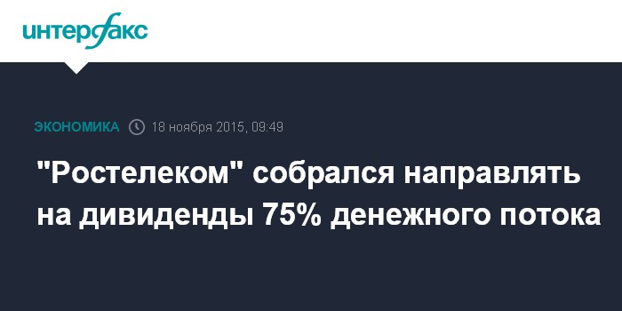 Москва. 18 ноября. INTERFAX.RU – Проект новой дивидендной политики "Ростелекома" предусматривает выплату акционерам в 2016-2018 годах не менее 75% от свободного денежного потока, сообщила газета "Коммерсантъ" со ссылкой на источники, знакомые с предложением.