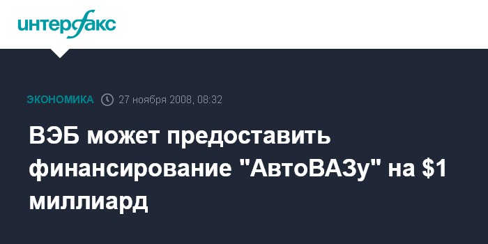 Москва. 27 ноября. INTERFAX.RU - Внешэкономбанк (ВЭБ) может предоставить "АвтоВАЗу" финансирование на сумму $1 млрд, сообщил агентству "Интерфакс-АФИ" источник в финансовых кругах.