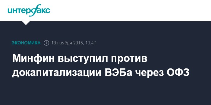 Москва. 18 ноября. INTERFAX.RU – Минфин выступает против докапитализации Внешэкономбанка через ОФЗ, заявил глава ведомства Антон Силуанов.