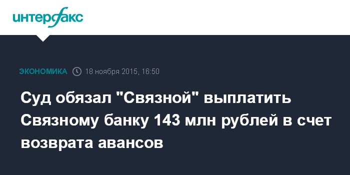 Москва. 18 ноября. INTERFAX.RU – Арбитражный суд Москвы принял решение взыскать со "Связного" в пользу Связного банка 141,8 млн рублей в счет возврата авансов по коммерческим контрактам между компаниями, следует из материалов суда.