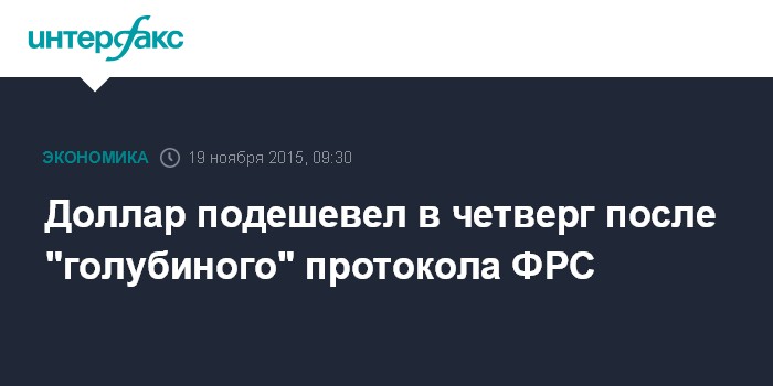 Москва. 19 ноября. INTERFAX.RU – Доллар прервал ралли, потеряв не менее 0,3% в парах со всеми основными валютами развитых стран, так как протокол октябрьского заседания Федеральной резервной системы зафиксировал довольно мягкую ("голубиную") позицию руководителей американского ЦБ, сообщает агентство Bloomberg.
