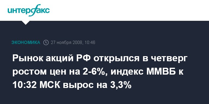 Москва. 27 ноября. INTERFAX.RU - Российский рынок акций открылся в четверг ростом цен большинства ликвидных бумаг на 2-6% на фоне подъема мировых фондовых площадок и нефти накануне, индекс ММВБ к 10:32 МСК вырос на 3,3% - до 607,34 пункта.