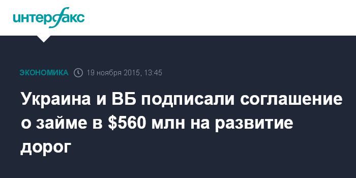 Москва. 19 ноября. INTERFAX.RU – Украина в четверг подписала с Международным банком реконструкции и развития (входит в группу Всемирного банка) соглашение о займе в размере $560 млн на финансирование проекта развития дорожной отрасли подписано в четверг.