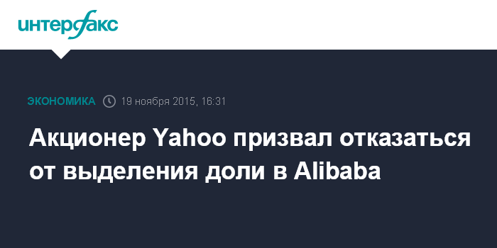 Москва. 19 ноября. INTERFAX.RU – Инвестфонд Starboard Value призвал американскую интернет-компанию Yahoo! Inc. отказаться от выделения в независимую компанию доли в китайской Alibaba Group Holding и взамен продать бизнес, занимающийся интернет-поиском, сообщает агентство Bloomberg.