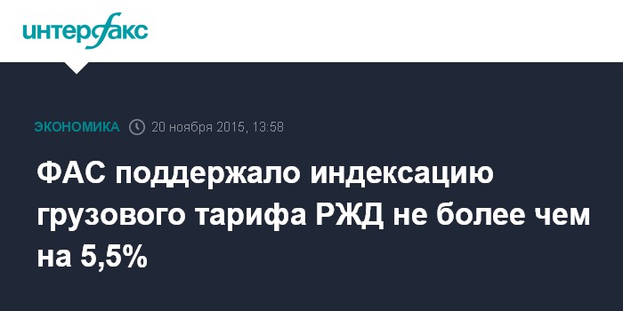 Москва. 20 ноября. INTERFAX.RU - Федеральная антимонопольная служба (ФАС) РФ настаивает на индексации грузового тарифа ОАО "РЖД" в 2016 году на уровне не более 5,5%, индексацию газового поддерживает на уровне 2%, заявил глава ведомства Игорь Артемьев.