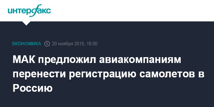 Москва. 20 ноября. INTERFAX.RU – Межгосударственный авиационный комитет (МАК) предлагает российским авиакомпаниям перенести регистрацию самолетов из иностранной в национальную юрисдикцию.