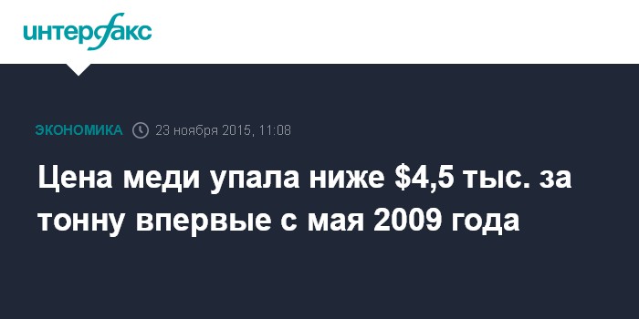 Москва. 23 ноября. INTERFAX.RU - Стоимость меди опустилась в понедельник ниже уровня в $4500 за тонну впервые с мая 2009 года, сообщает агентство Bloomberg.