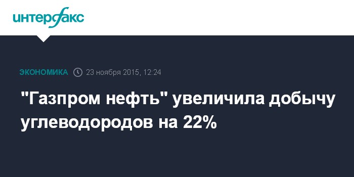 Москва. 23 ноября. INTERFAX.RU - "Газпром нефть" увеличила добычу углеводородов за 9 месяцев 2015 года на 22% - до 436,4 млн баррелей нефтяного эквивалента (58,76 млн тонн н.э.), говорится в сообщении компании.