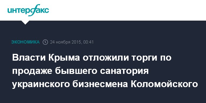 Москва. 24 ноября. INTERFAX.RU - Власти Крыма отложили с 27 ноября на 1 декабря аукцион по продаже по стартовой цене 1,4 млрд рублей санатория "Форос", национализированного у украинского бизнесмена Игоря Коломойского, говорится в материалах, размещенных на сайте torgi.gov.ru.
