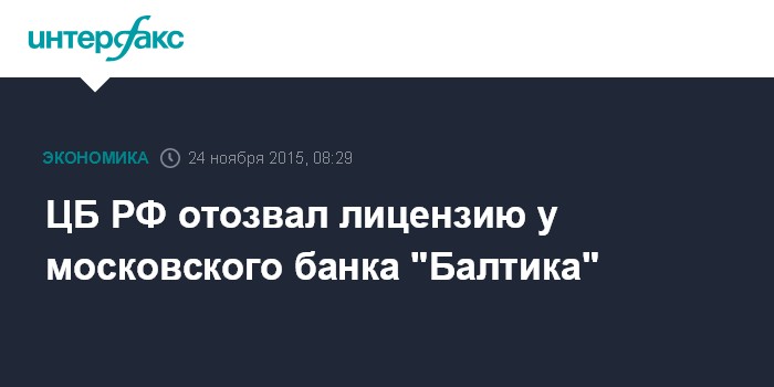 Москва. 24 ноября. ИНТЕРФАКС - Банк России отозвал лицензию на осуществление банковских операций у зарегистрированного в Москве банка "Балтика", говорится в сообщении ЦБ.