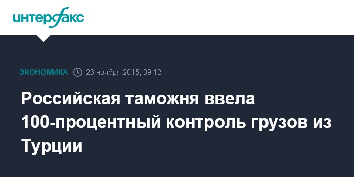 Москва. 26 ноября. INTERFAX.RU - Таможенные органы РФ со среды перешли на процедуру полного досмотра грузов, прибывающих из Турции, сообщили "Интерфаксу" представители нескольких логистических компаний.