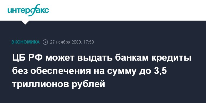 Москва. 27 ноября. INTERFAX.RU - Банк России может выдать банкам кредиты без обеспечения на сумму до 3,5 трлн рублей.