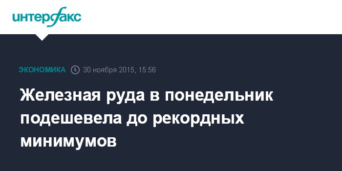 Москва. 30 ноября. INTERFAX.RU – Железная руда в понедельник подешевела до рекордных минимумов, сообщило агентство Bloomberg.