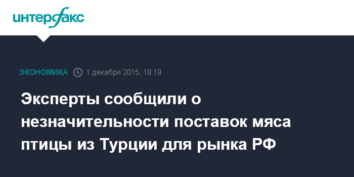 Москва. 1 декабря. INTERFAX.RU - Российский рынок не заметит прекращения поставок мяса птицы из Турции, поскольку их объемы очень малы, заявили "Интерфаксу" эксперты.