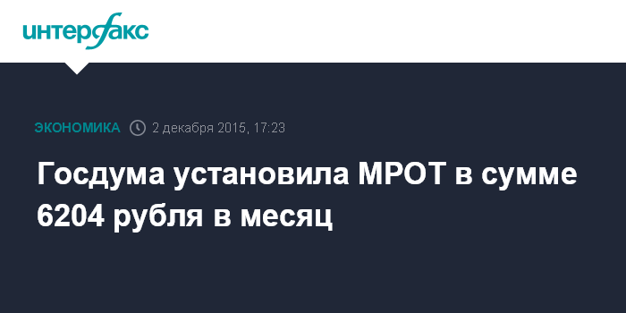 Москва. 2 декабря. INTERFAX.RU - Госдума на заседании в среду приняла во втором и третьем чтении закон, устанавливающий в 2016 году минимальный размер оплаты труда (МРОТ) в сумме 6204 рубля в месяц.