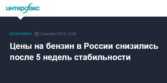 Москва. 3 декабря. INTERFAX.RU – Потребительские цены на бензин в России с 24 по 30 ноября снизились на 0,1%, сообщил Росстат.