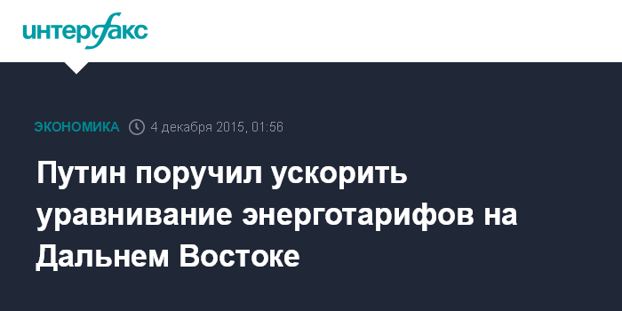 Москва. 4 декабря. INTERFAX.RU - Президент РФ Владимир Путин поручил правительству ускорить принятие решения по энерготарифам на Дальнем Востоке.