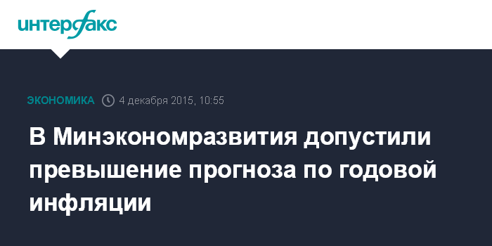 Москва. 4 декабря. INTERFAX.RU – Инфляция в России в 2015 году может несколько превысить официальный прогноз в 12,4%, так как в декабре в некоторые недели рост цен может составить 0,2%, а не 0,1%, сказал "Интерфаксу" директор сводного департамента макроэкономического прогнозирования Минэкономразвития Кирилл Тремасов в кулуарах XIII Российского облигационного конгресса.