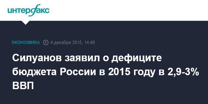 Москва. 4 декабря. INTERFAX.RU - Дефицит бюджета РФ по итогам 2015 года составит 2,9-3% ВВП, сказал министр финансов Антон Силуанов в эфире телеканала "Россия 24", комментируя решение агентства Moody's изменить прогноз кредитного рейтинга по гособлигациям РФ до "стабильного" с "негативного".