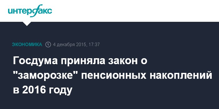 Москва. 4 декабря. INTERFAX.RU – Госдума на заседании в пятницу приняла в третьем чтении закон о "заморозке" пенсионных накоплений. Документ устанавливает обязанность Пенсионного фонда России (ПФР) учитывать взносы на обязательное пенсионное страхование в 2016 году, исходя из направления полного размера индивидуальной части тарифа страхового взноса на финансирование страховой пенсии.