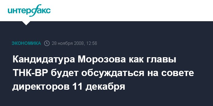 Москва. 28 ноября. INTERFAX.RU - Кандидатура Дениса Морозова как главы ТНК-BP будет обсуждаться на совете директоров компании 11 декабря, сообщил журналистам исполнительный директор ТНК-ВР Виктор Вексельберг.