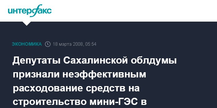 Южно-Сахалинск. 18 марта. ИНТЕРФАКС-ДАЛЬНИЙ ВОСТОК - Депутаты Сахалинской облдумы признали неэффективным использование средств областного и федерального бюджетов, вложенных в реконструкцию малой ГЭС на реке Матросской в Северо-Курильске.