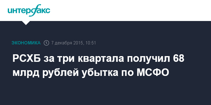 Москва. 7 декабря. INTERFAX.RU – Россельхозбанк за три квартала этого года получил 67,9 млрд рублей чистого убытка по МСФО, увеличив отрицательный результат в 8,1 раза в годовом выражении, свидетельствует отчетность банка.