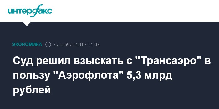 Москва. 7 декабря. INTERFAX.RU – Арбитражный суд Москвы в понедельник удовлетворил иск "Аэрофлота" о взыскании с авиакомпании "Трансаэро" 5,3 млрд рублей долга по договору займа.