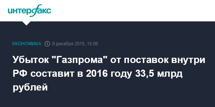Убыток "Газпрома" от поставок внутри РФ составит в 2016 году 33,5 млрд рублей