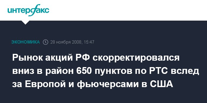 Москва. 28 ноября. INTERFAX.RU - Российский рынок акций в пятницу скорректировался вниз по большинству blue chips вслед за европейскими и американскими фондовыми индикаторами, а также на фоне подешевевшей нефти; индекс РТС скатился в район 650 пунктов.