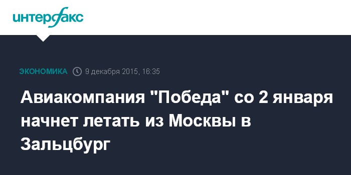 Москва. 9 декабря. INTERFAX.RU – Лоукостер "Победа" (100%-ная "дочка" "Аэрофлота") открыла продажу билетов на рейсы в Зальцбург, которые будут выполняться со 2 января 2016 года по субботам.