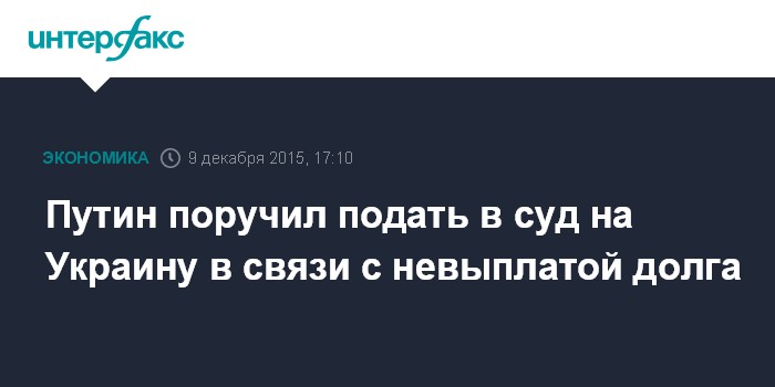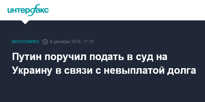 Москва. 9 декабря. INTERFAX.RU – Президент Владимир Путин поручил министру финансов Антону Силуанову подать в суд на Украину в связи с невозвращением кредита в 3 млрд долларов.