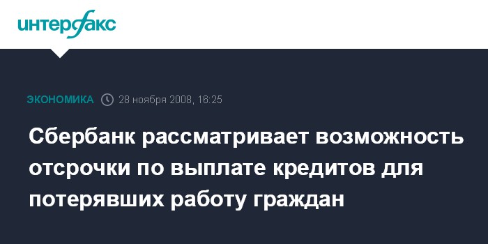 Москва. 28 ноября. INTERFAX.RU - Сберегательный банк РФ рассматривает возможность применения отсрочек по выплатам кредитов для граждан, потерявших работу, сообщил президент - председатель правления банка Герман Греф журналистам в Ростове-на-Дону в пятницу.