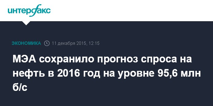 Москва. 11 декабря. INTERFAX.RU – Международное энергетическое агентство (МЭА) ожидает роста мирового спроса на нефть в 2016 году на 1,2 млн баррелей в сутки (б/с) - до 95,6 млн б/с, говорится в ежемесячном обзоре агентства.