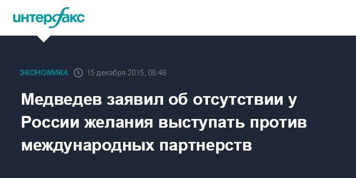 Москва. 15 декабря. INTERFAX.RU - Россия не против международных партнерств и объединений, но необходимы единые правила поведения в экономической сфере в связи со снижением индикаторов международной торговли и повышенной волатильностью валют, заявил премьер РФ Дмитрий Медведев в рамках заседания Совета глав правительств ШОС.