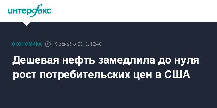 Москва. 15 декабря. INTERFAX.RU – Потребительские цены (индекс CPI) в США в ноябре не изменились по сравнению с предыдущим месяцем, когда был зафиксирован подъем на 0,2%, на фоне падения стоимости нефти и других энергоносителей, свидетельствуют данные министерства труда страны. При этом повышение цен относительно ноября прошлого года ускорилось до 0,5% с 0,2% в октябре.
